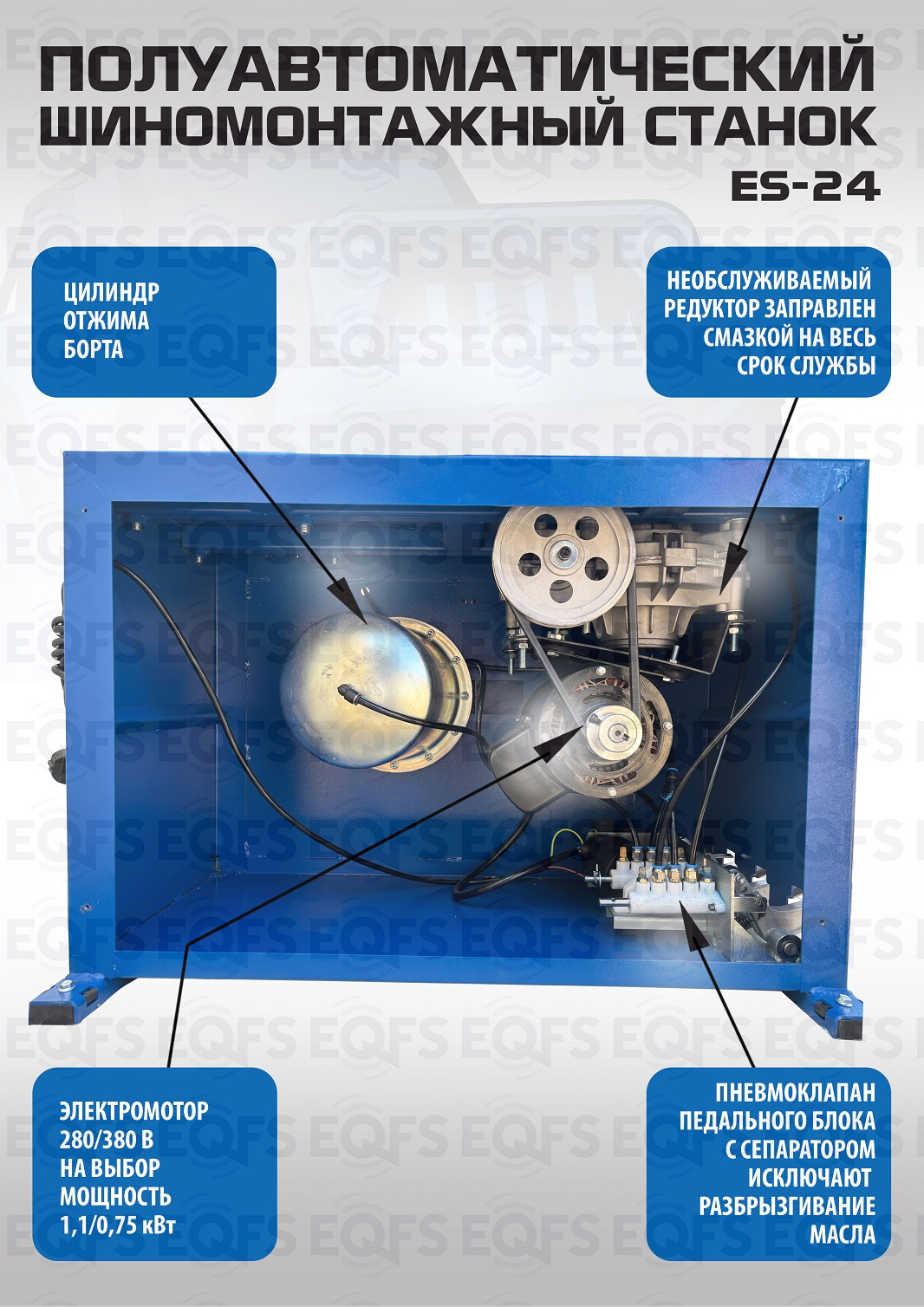 Особенности конструкции полуавтоматического шиномонтажного станка ES-24:Материал шиномонтажного "штока" высокопрочная сталь с шестигранным сечением толщиной 41мм. Не гнется при разбортировки.